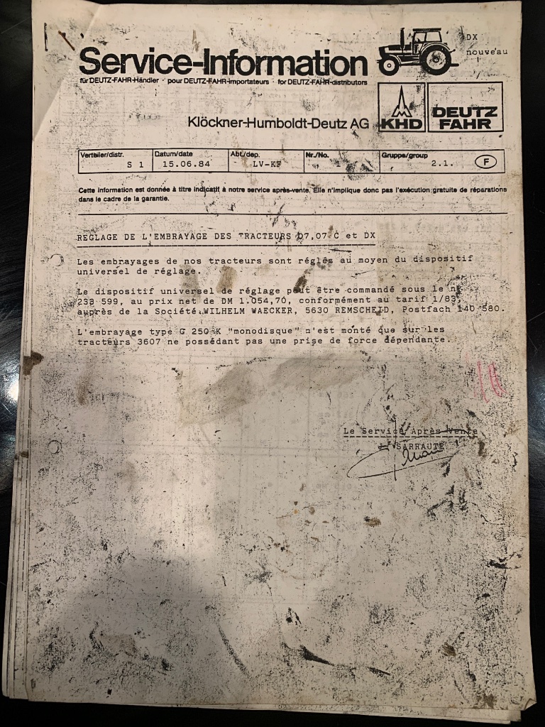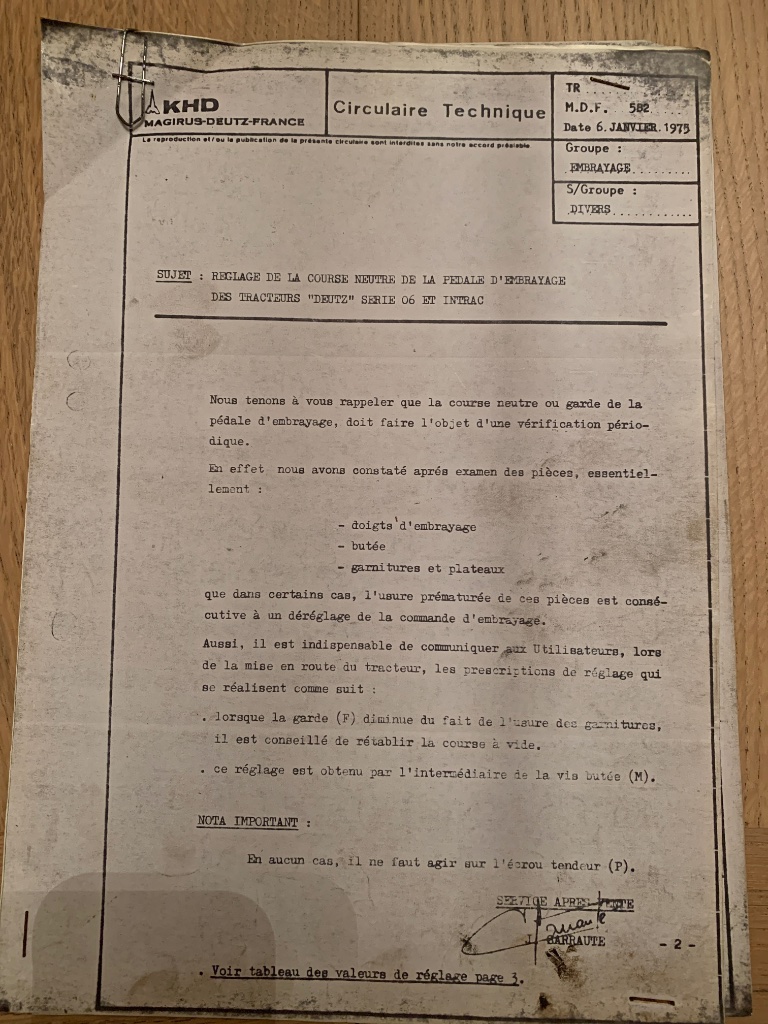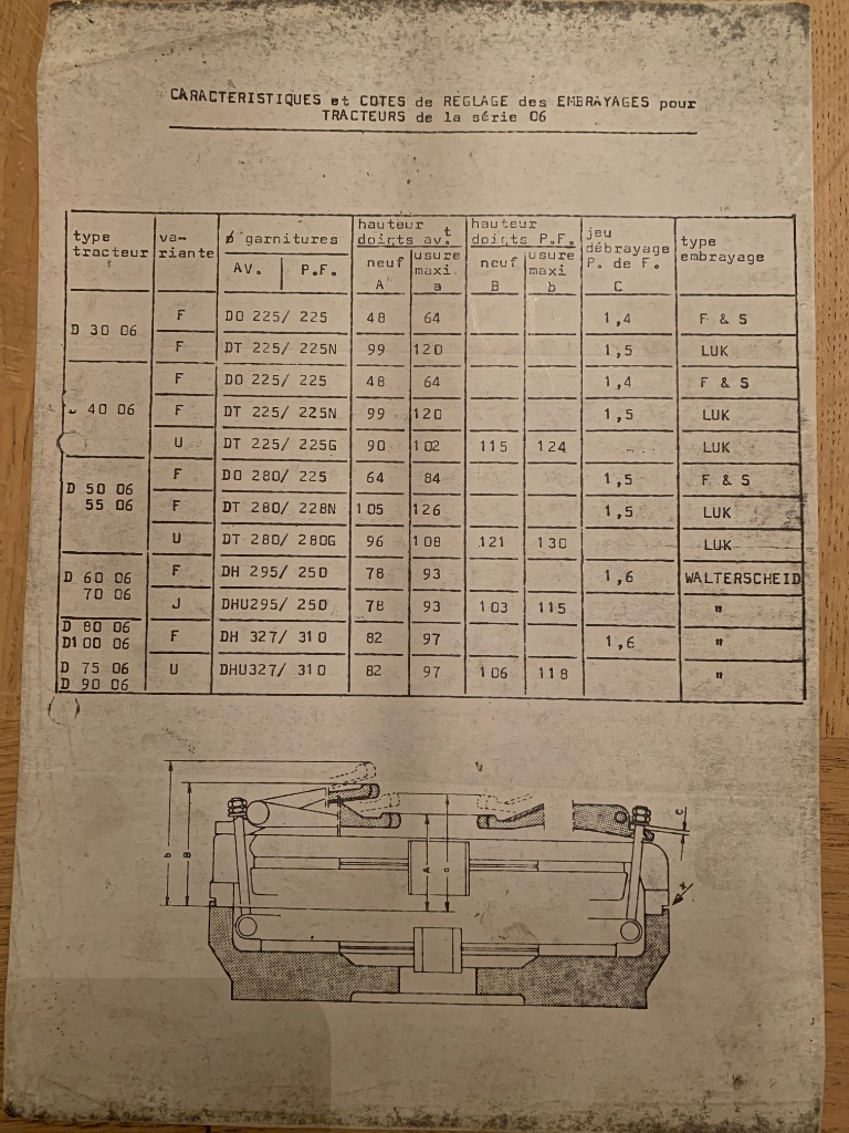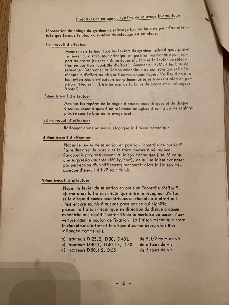 Place aux plus anciens: D30S D40L D40S D40.1S D50.1S D55, avec des informations concernant les embrayages mais également le calage du système de relevage à double contrôle: