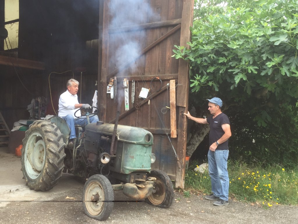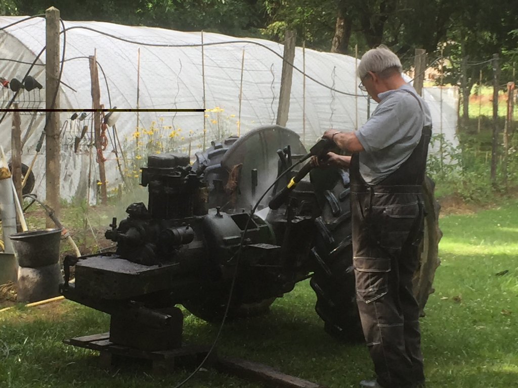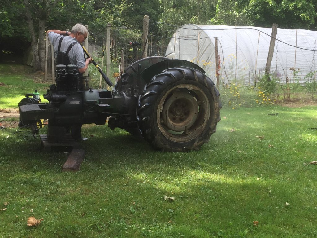 Ce tracteur est vigneron, c'est vrai, mais sa mise en conformité largeur pour l'entre rang se fait, après déblocage des vis de la jante avec une courte marche arrière ou marche avant . Pas de démontage de roue avec le cric! Quand j'avais 12 ans, je trouvais cette procédure miraculeuse!