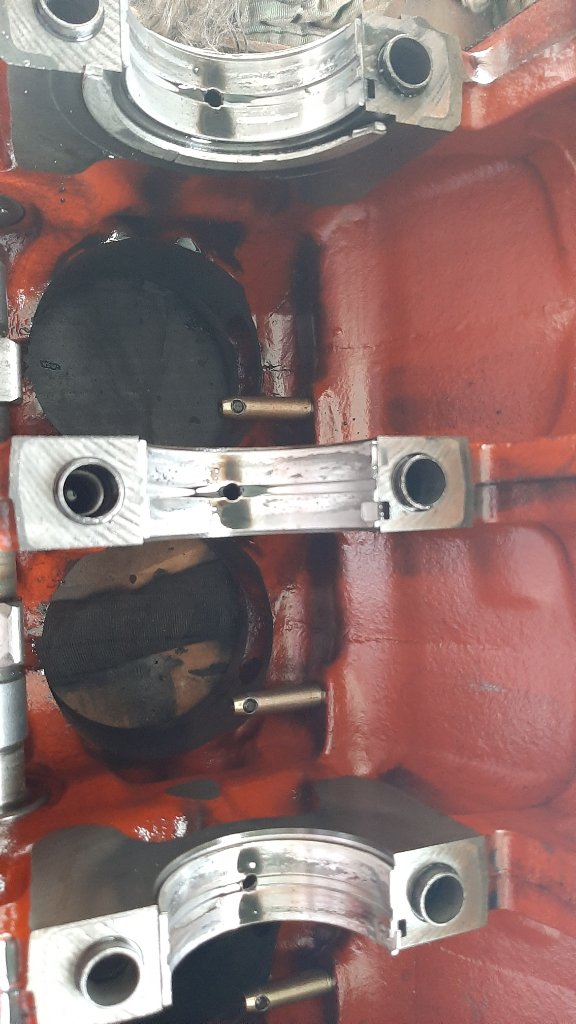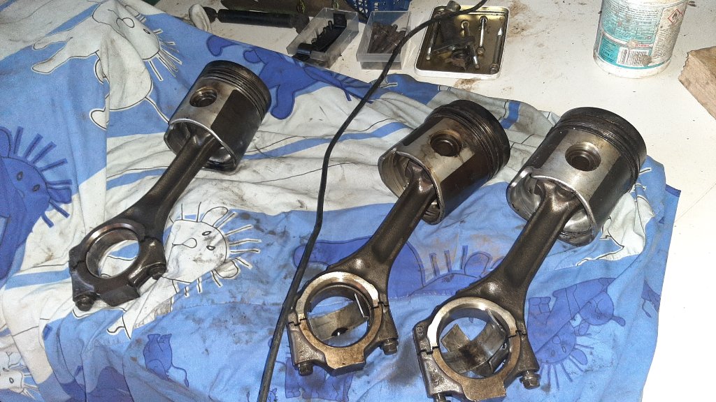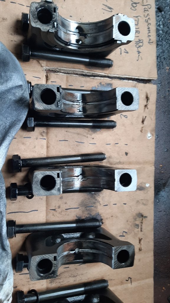 Les autres bielles avec leur pistons, bielles qui ne sont pas ovalisées et leur coussinets ne sont pas en miettes comparé à l'autre ...