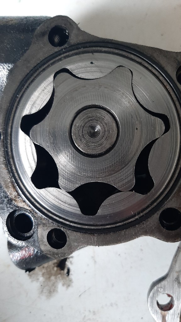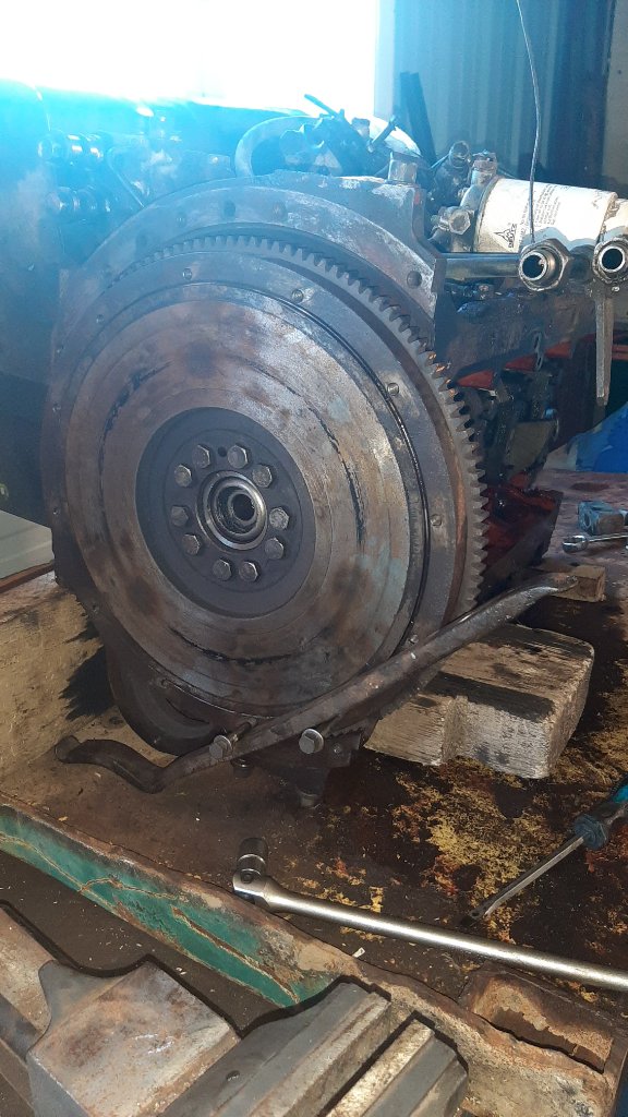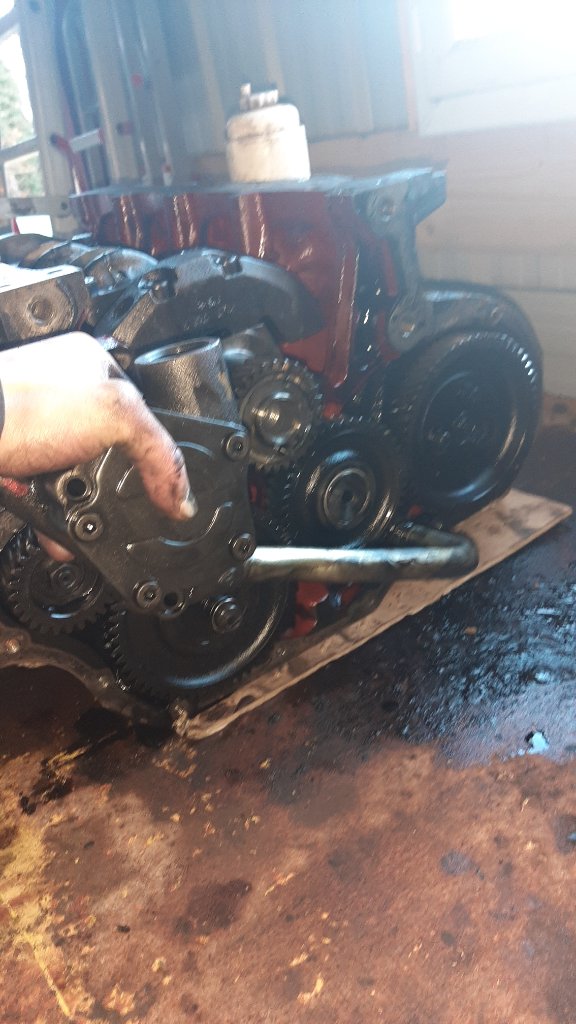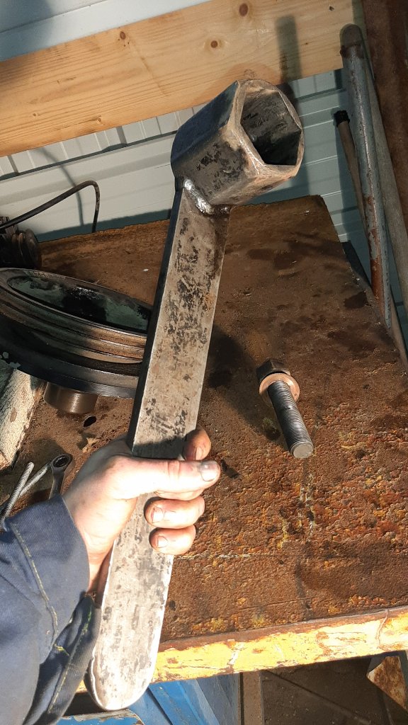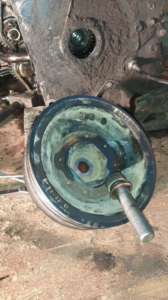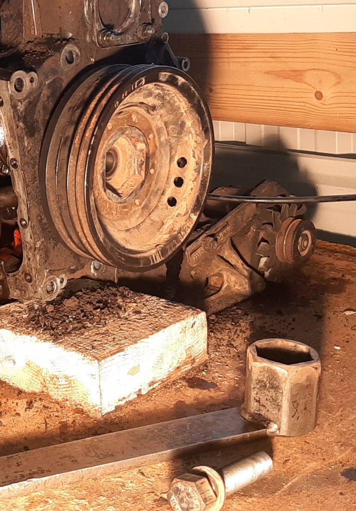 Démonter la poulie moteur, c'est autre chose. Déjà c'est un pas à gauche et c'est bien serré, j'avais demandé de l'aide sur le forum car je ne savais pas si c'était bien un pas à gauche. J'ai réussi mais préférez la défaire pendant que le moteur et sur le tracteur c'est plus facile.