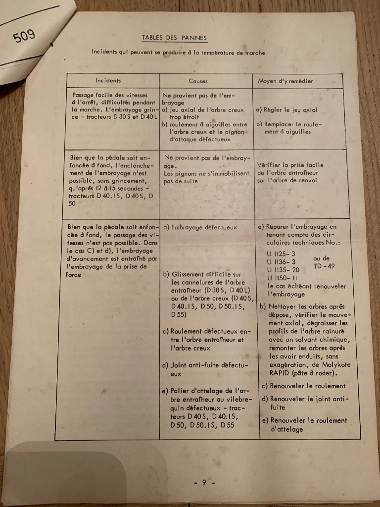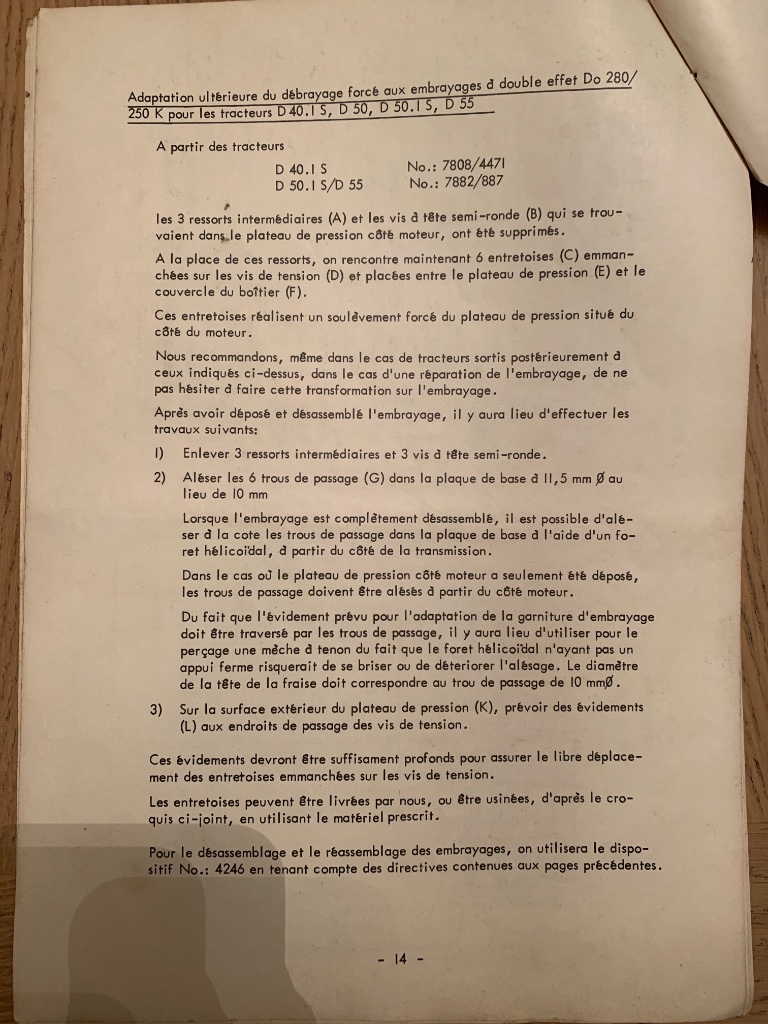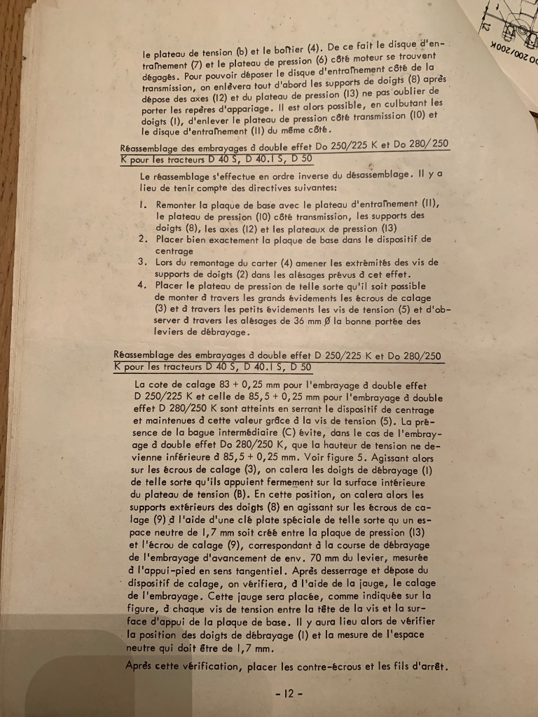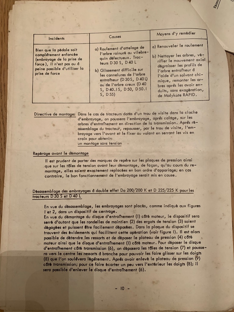 Place aux plus anciens: D30S D40L D40S D40.1S D50.1S D55, avec des informations concernant les embrayages mais également le calage du système de relevage à double contrôle: