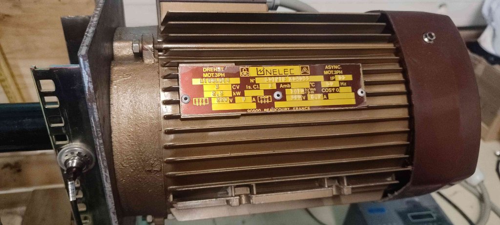 Un moteur tri-phasé 220V à 50 euros d'occasion, piloté par un variateur de fréquence ce qui permet de faire varier la vitesse du moteur.